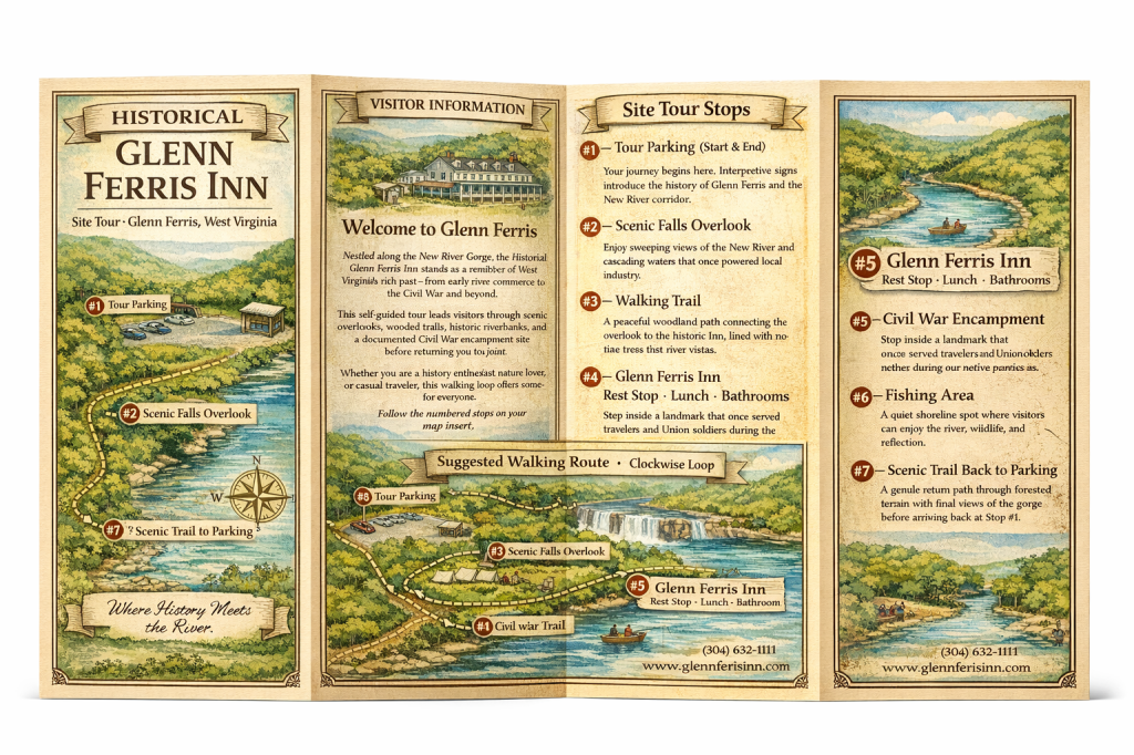 From there, history comes vividly to life at the Civil War Encampment site. During the war, the Glen Ferris Inn served as Union headquarters, and soldiers camped along the river nearby. Today, interpretive displays and reconstructed elements help visitors imagine what life was like for those stationed here more than 160 years ago. During the Civil War, the Glen Ferris Inn occupied a strategically important position along the Kanawha River and the Midland Trail, making it a valuable asset for Union forces operating in the Kanawha Valley. In 1861–1862, Federal troops used the inn as a temporary headquarters and staging point while securing transportation routes, protecting river traffic, and monitoring Confederate movement in southern West Virginia. The nearby riverbanks also served as a makeshift encampment for soldiers, tying the inn directly to the military landscape of the valley and the broader Union effort to control western Virginia.(1)